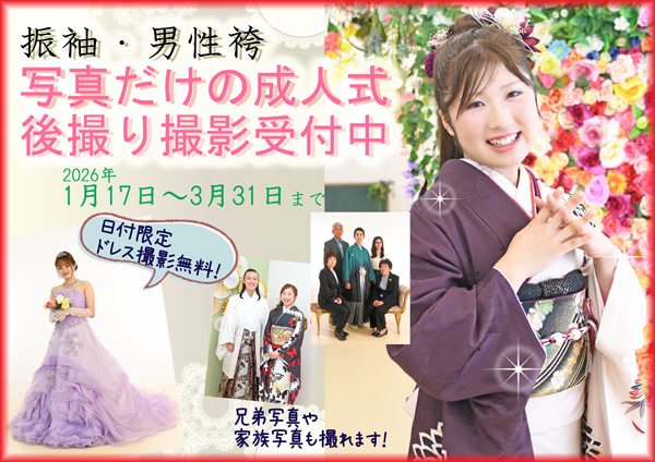 写真だけの成人式や、七五三・家族写真・入卒記念・ブライダルなど
