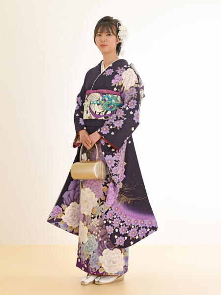 振袖は紫を基調としており胸元から裾にかけて、濃い紫から淡い紫に!小花から可憐で大柄の薔薇へ!長身のお嬢様に着ていただくと、より美しく流動感のある振袖になります*ଘ(੭*ˊᵕˋ)੭* ੈ✩‧₊˚