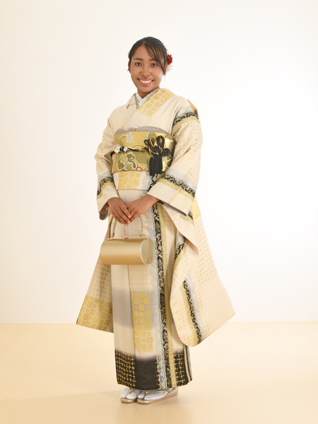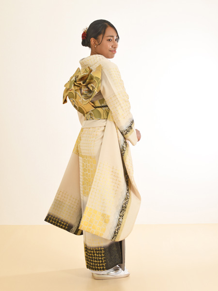 こちらの振袖は、クリームっぽい白地にゴールド&シルバー&ブラックを品よく施されたデザインになっております。お嬢様によくお似合いで、お嬢様のためにお仕立てされたように感じちゃいますね (*๓´╰╯`๓)♡