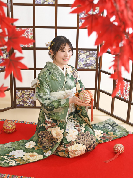 こんにちは。紅葉の間からのぞく笑顔がとても美しいお嬢様の紹介です。セットの赤と振袖の緑のコントラストが、まるで京都で撮影しているように思えてきますね☆☆