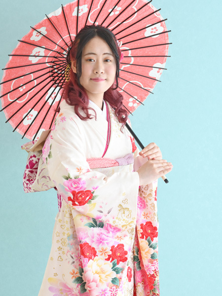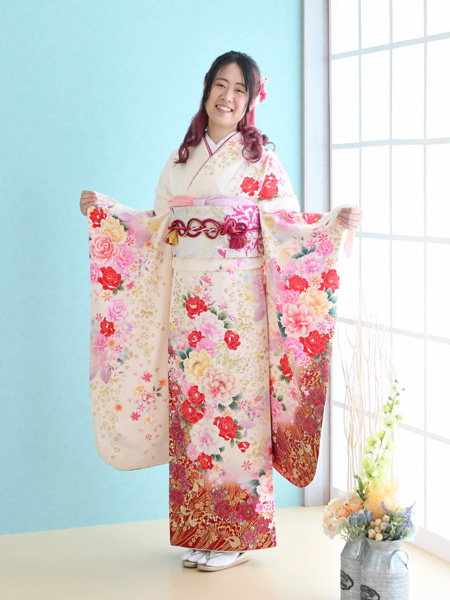 振袖前撮り撮影 白地に赤ピンクの花模様