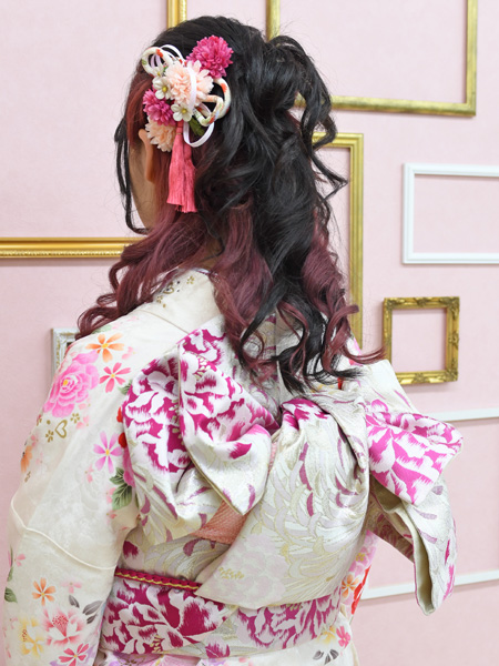 高い位置にボリュームを出しながら、優しいイメージでふんわり巻おろしのヘアアレンジになっております。振袖にお似合いの髪色に仕上げてきていただいて、オシャレ上級お嬢様ですね ٩(ˊᗜˋ*)و