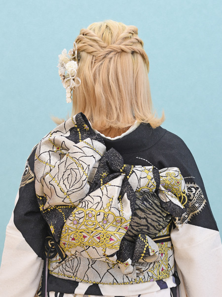 帯結びは左の羽にボリュームを持たせてアシンメトリー風に仕上げてみました。後ろからの雰囲気も素敵ですね(*˘︶˘*)