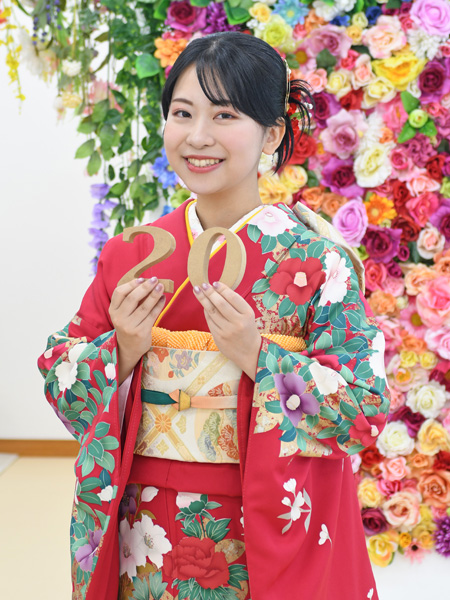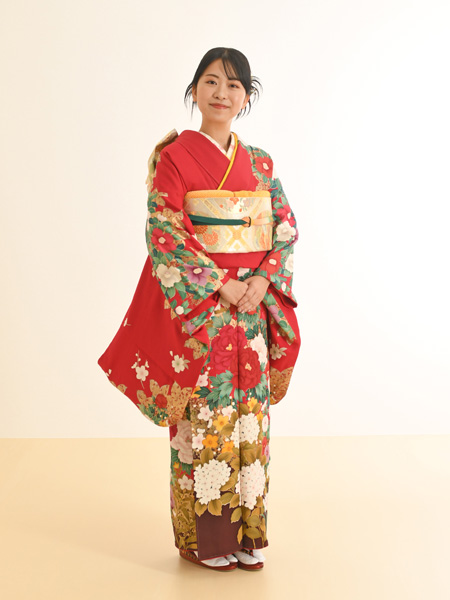 振袖写真のお客様 椿が色鮮やかに咲く振袖♥♥ シンデレラスタッフ 2026年4月9日 こんにちは! お持込みいただいた振袖で撮影されたお嬢様のご紹介です。肩から袖にかけて椿の花が咲きほこり、とても美しいですね。笑顔も素敵です! お持ちいただいた振袖はお袖が短めの「小振袖」で袴との相性も抜群な振袖ですね★ 軽やかな印象でとってもキュート!! ヘアスタイルは今、流行中の「カチモリヘア」です。韓国が発祥で、おだんごなどにまとめた髪の毛先をあえて出しています。とっても今っぽい雰囲気が出るのでおすすめ★ 振袖をお持ち込みにてのお撮影はこちらから 写真だけの成人式の詳細はこちらから ← ゴールデンウィーク休業のお知らせ 紫の花が浮かび上がる幻想的な振袖✿ →
